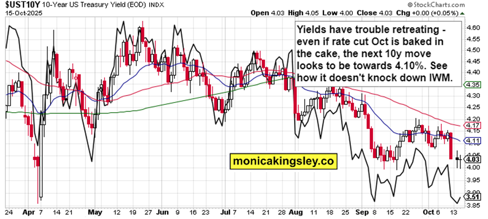 S&P 500 was accepted above 6,720s resistance, reaching through 6,765 – rejected on China headline, and didn‘t stop at 6,665 resistance turned support. While breadth is nothing to write home about, all three indices continue the grind higher, ES recapturing 6,740, with Nasdaq closer to its yesterday‘s peak than the 500-strong index – and Russell 2000 of course in the lead, of course.