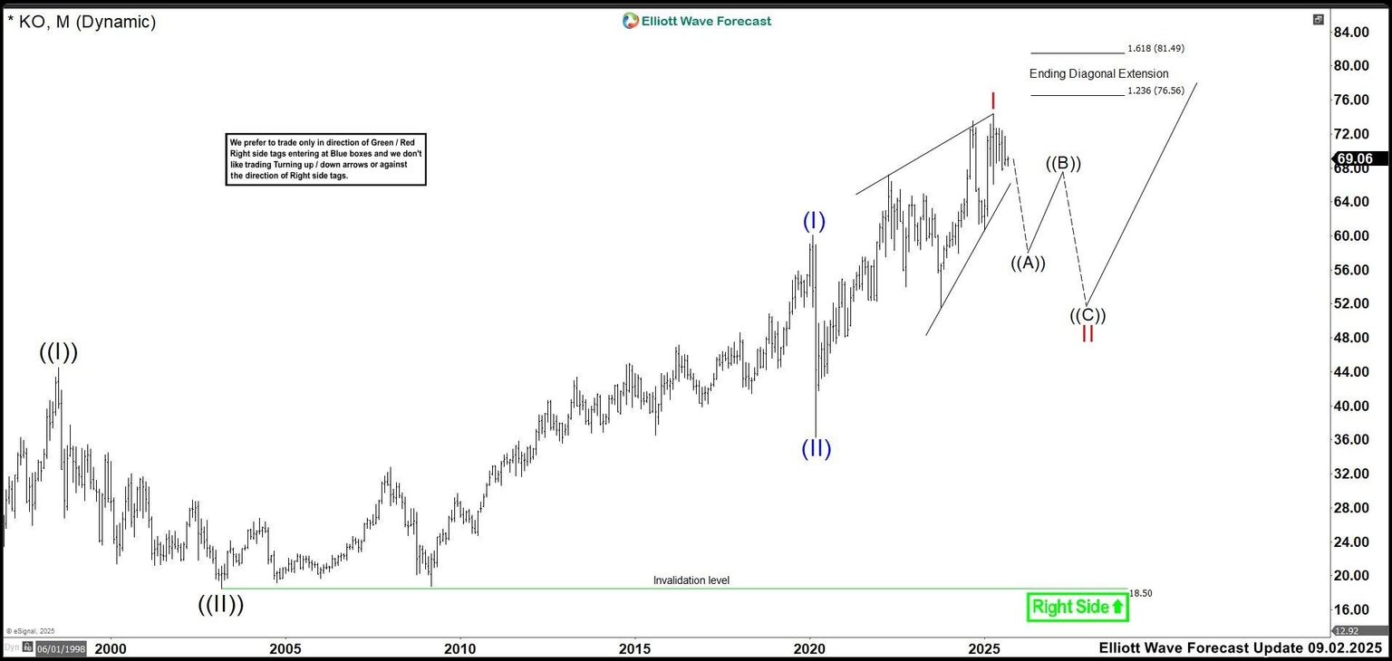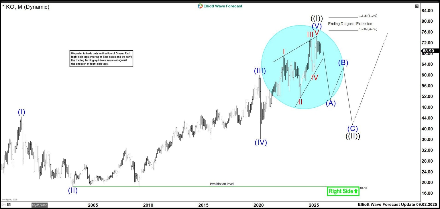 Elliott Wave outlook ending diagonal: KO monthly chart September 2025