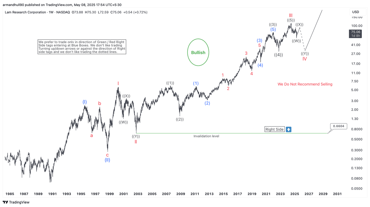 Wave III topped with a well-defined five-wave pattern from the 2009 low. The chart shows strong momentum and clean internal subdivisions, supporting the view of an extended bullish phase. Now, Lam Research is undergoing a correction in wave IV, which appears to form a double zigzag. The corrective sequence is labeled as ((W))-((X))-((Y)).