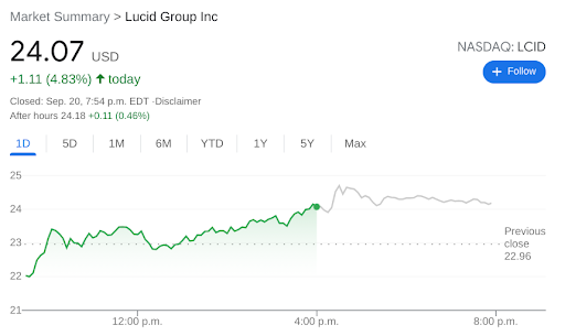 NASDAQ:LCID is finally starting to see some positive momentum and even outperformed the broader markets to start the week. On Monday, shares of Lucid gained 4.83% and closed the trading day at $24.07. The move higher came amidst a global market sell off, as the NASDAQ tumbled by 2.19% and the Dow and S&P 500 both lost over 1.7%. It was the worst day for U.S. markets since May. The EV sector fell nearly across the board, as fears of sweeping regulatory changes in China caused EV makers like Nio (NYSE:NIO), XPeng (NYSE:XPEV), and Li Auto (NASDAQ:LI) to all fall by at least 6.0% during the session.