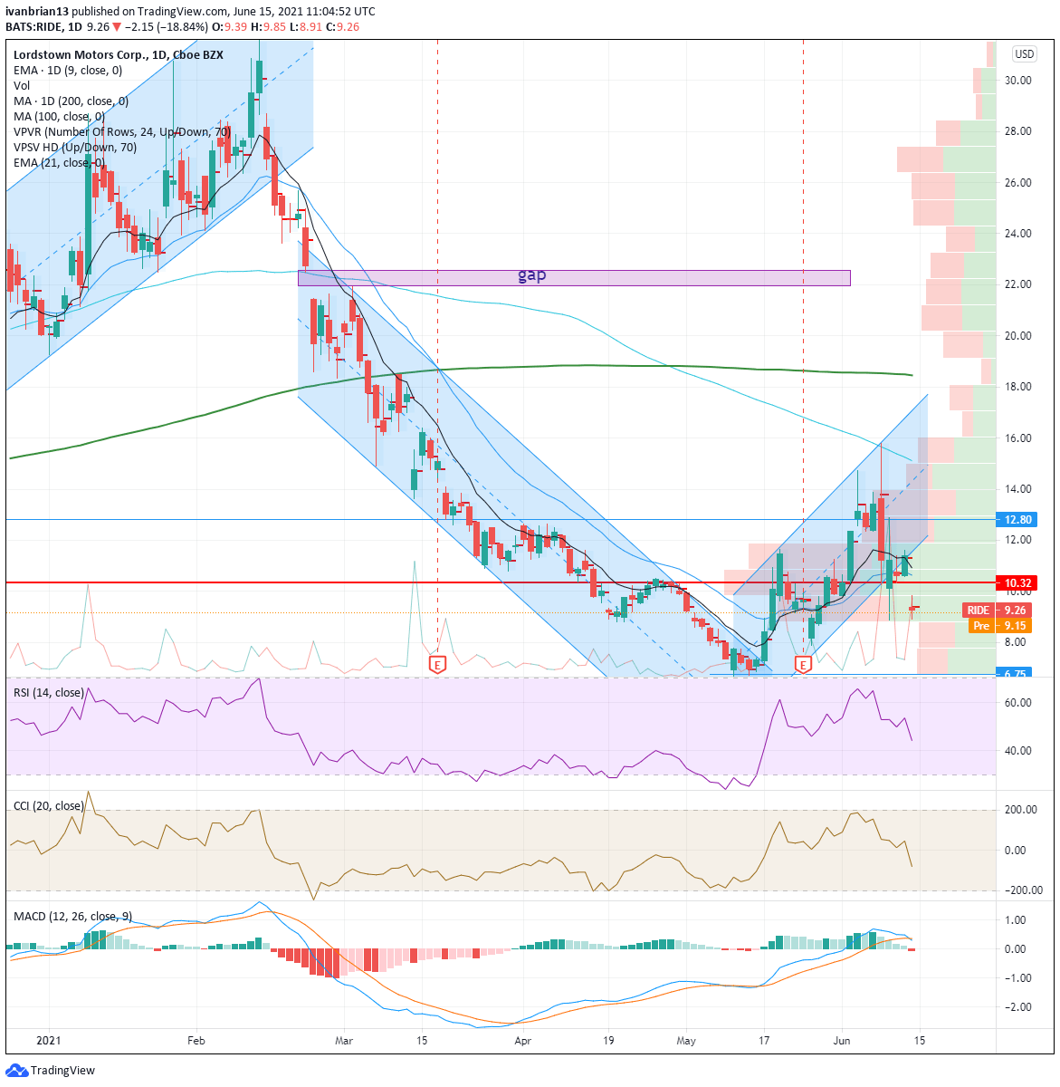 The results on May 24 were not exceptional and Lordstown said that the anticipated production of its Endurance truck was to be half of the prior expectations. The company also said after the results release that additional capital was needed to meet its business and production plans. The stock tanked and closed nearly 8% lower at $8.95. Bizarrely, RIDE then got caught up in the second or third wave (I have lost count) of meme stock madness, which saw AMC shares take off for the moon. RIDE shares nearly doubled over the next ten trading sessions to $15.80 despite no new news.