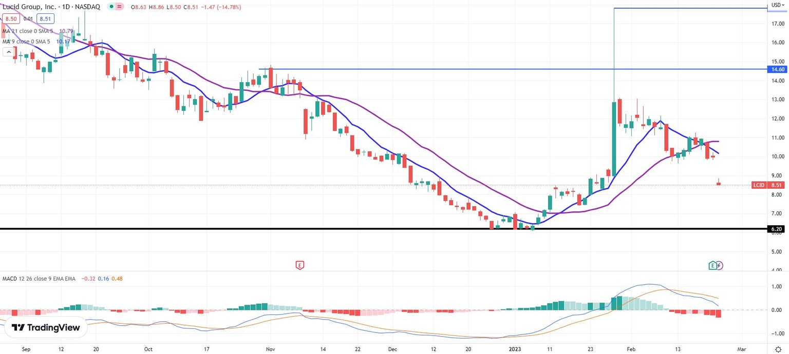 Now at $8.50 in Thursday's session, Lucid stock is sitting on the range high from January 12. A break there would send LCID down to support from late last month around $7.40. Below there sits the December support level of $6.20. LCID stock has been trending lower since the January 27 high of $17.80 based on those Saudi rumors. The 9-day moving average crossed under the 21-day moving average last Friday, and the bearish crossover on the Moving Average Convergence Divergence (MACD) indicator happend a week before that. Both of these indicators were telling us that a downtrend was imminent. Only a break above $13 will place Lucid stock back in bullish mode.
