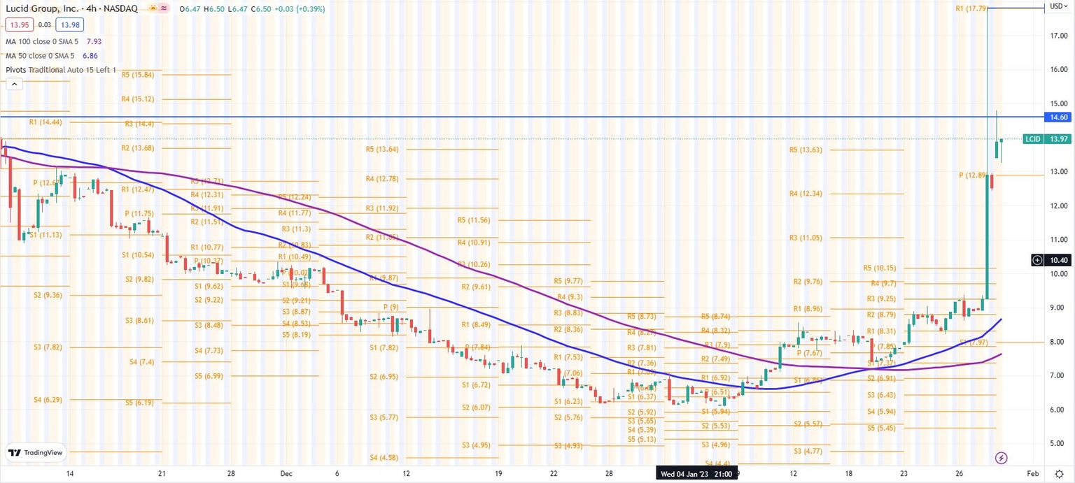 On the 4-hour chart below, the 50 four-hour moving average overtook the 100 four-hour moving average on January 19, so some bulls were probably already expecting a rally. Now bulls will try to take out the $17.80 high from Friday. That range high was brief, but it coincides with the R1 pivot and thus made a good selling point. Traders will also be well aware of past resistance surrounding $14.60 from last October. Support is scant at the moment, but expect traders to sell-off in short order if the Lucid stock price drops below the pivot point at $12.89.