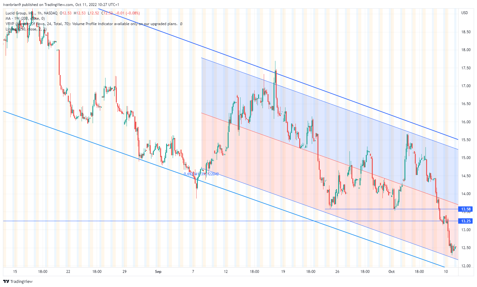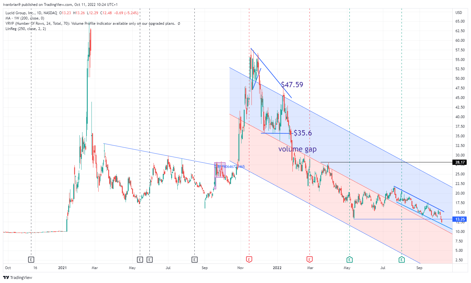 The strong yearly downtrend continues. Lucid has broken yearly support at $13.25 and is approaching the low of channel support at $11.88. This is the next support level, but it is not a significant support.