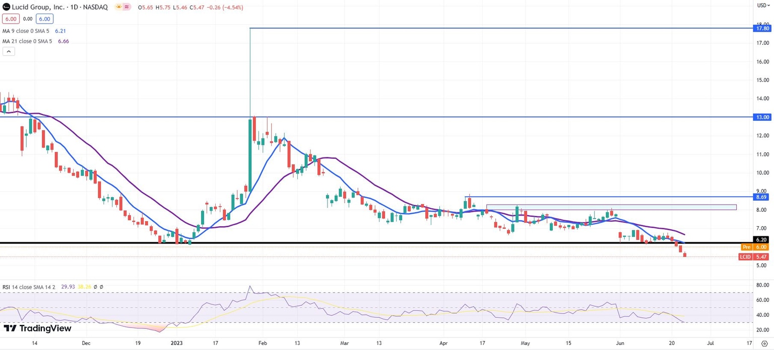 It was good timing on Lucid management’s part as LCID stock just reached an “oversold” status on the Relative Strength Index (RSI). Reaching $6 in the premarket is a positive sign, but shares really need to overtake the $6.20 former support level to lead traders toward a sustained rally. That level fortified the share price around New Year’s and then again in mid-June. A solid rally could push LCID up to the resistance range between $8 and $8.28 or even the $8.69 resistance level from April 11 and 12.