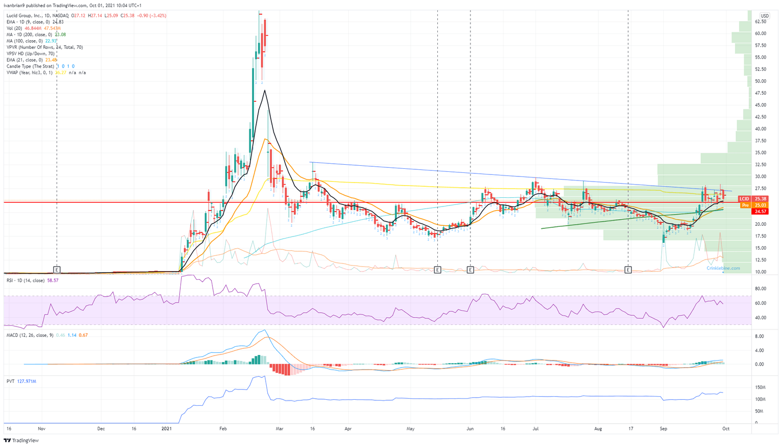 Wednesday's price action was a little disappointing but Lucid did hold above the 9-day moving average and also held above the breakout level of $24.50. This is also a strong support zone, as can be seen from the point of control at $24.57. The point of control is the price with the highest amount of volume, hence an equilibrium of sorts. We remain bullish so long as Lucid (LCID) stock holds above $25. Breaking lower brings support at $22, with a strong volume profile and the 200-day moving average just above, so that remains a buy the dip, but always use stops.