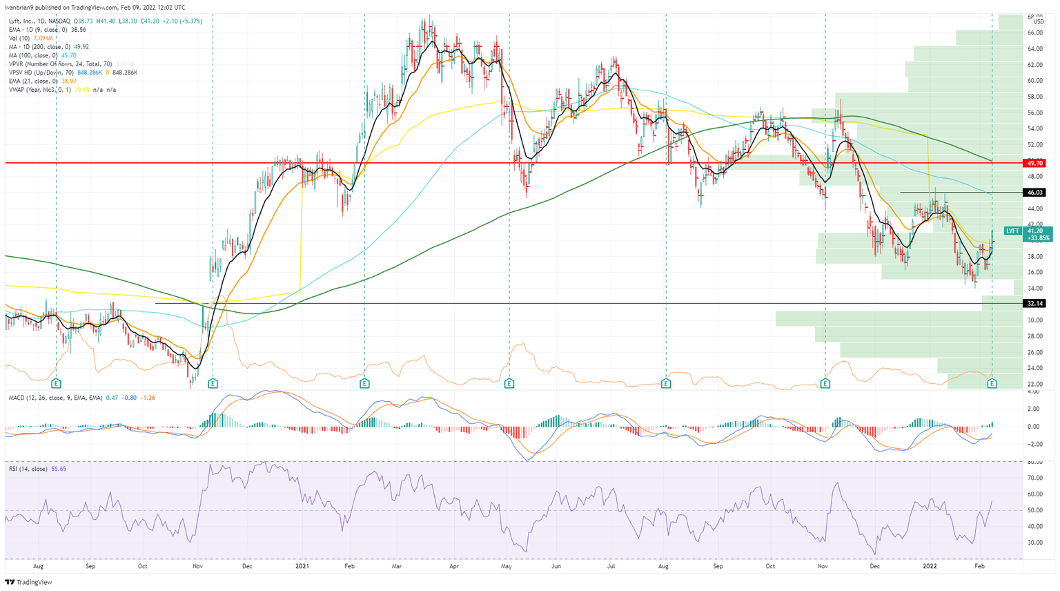 Support is at $32.14 to fill the earnings gap back in November 2020. There is also a notable volume gap if LYFT breaks $35, which should see an acceleration to $30. Volume is strong at $30, which should stabilise things. Resistance is at $46, and this breaks the current downtrend.