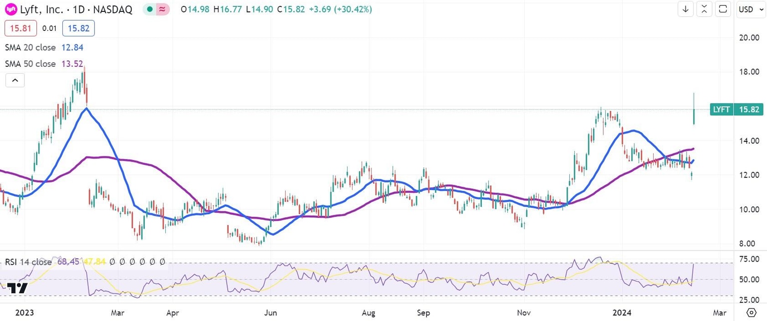 Lyft stock reached a one-year high on Wednesday at $16.77. LYFT stock has not traded at that latitude since February 9, 2023. After traders took some profits off the table on Wednesday, LYFT stock has settled in after lunchtime just below the December 18 high of $15.95.