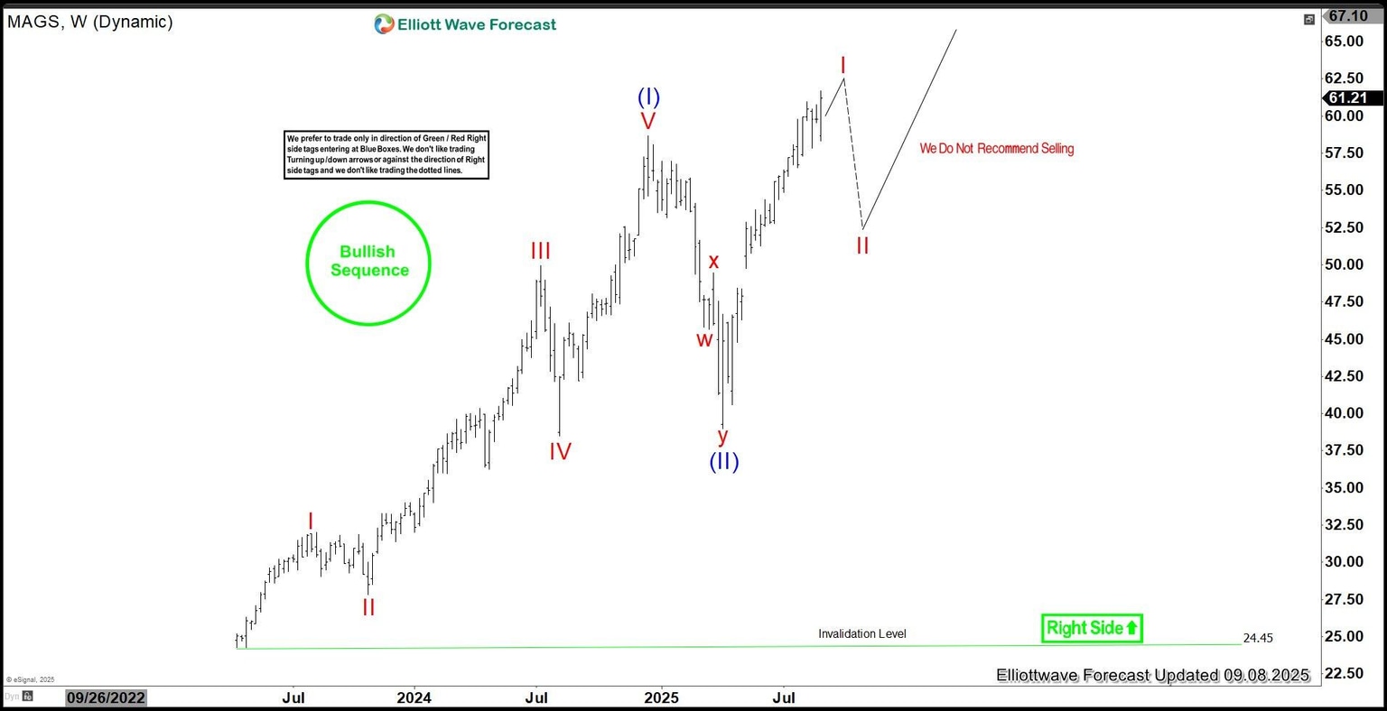 The daily Elliott Wave chart for the Magnificent Seven ETF (MAGS) reveals that wave (II) unfolded as a double-three corrective structure following the wave (I) all-time high at $58.69. Wave w declined to $45.67, wave x rebounded to $49.46, and wave y concluded at $38.98, completing wave (II). Since then, MAGS has initiated an impulsive rally, marking the start of wave (III).
