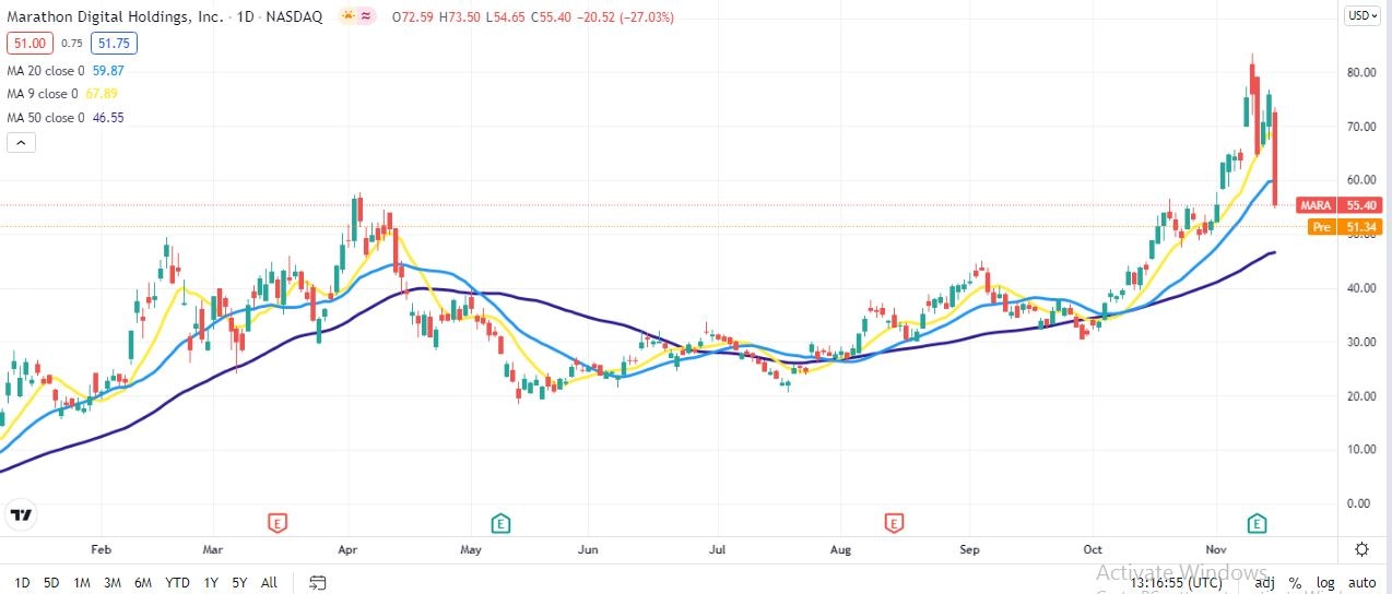 With MARA down over 6% in the premarket on Tuesday, it appears that the demand zone between Monday’s close at $55.40 and $49.46 may hold up. MARA stock’s all-time high just took place a week ago on November 9 when it reached $83.45.