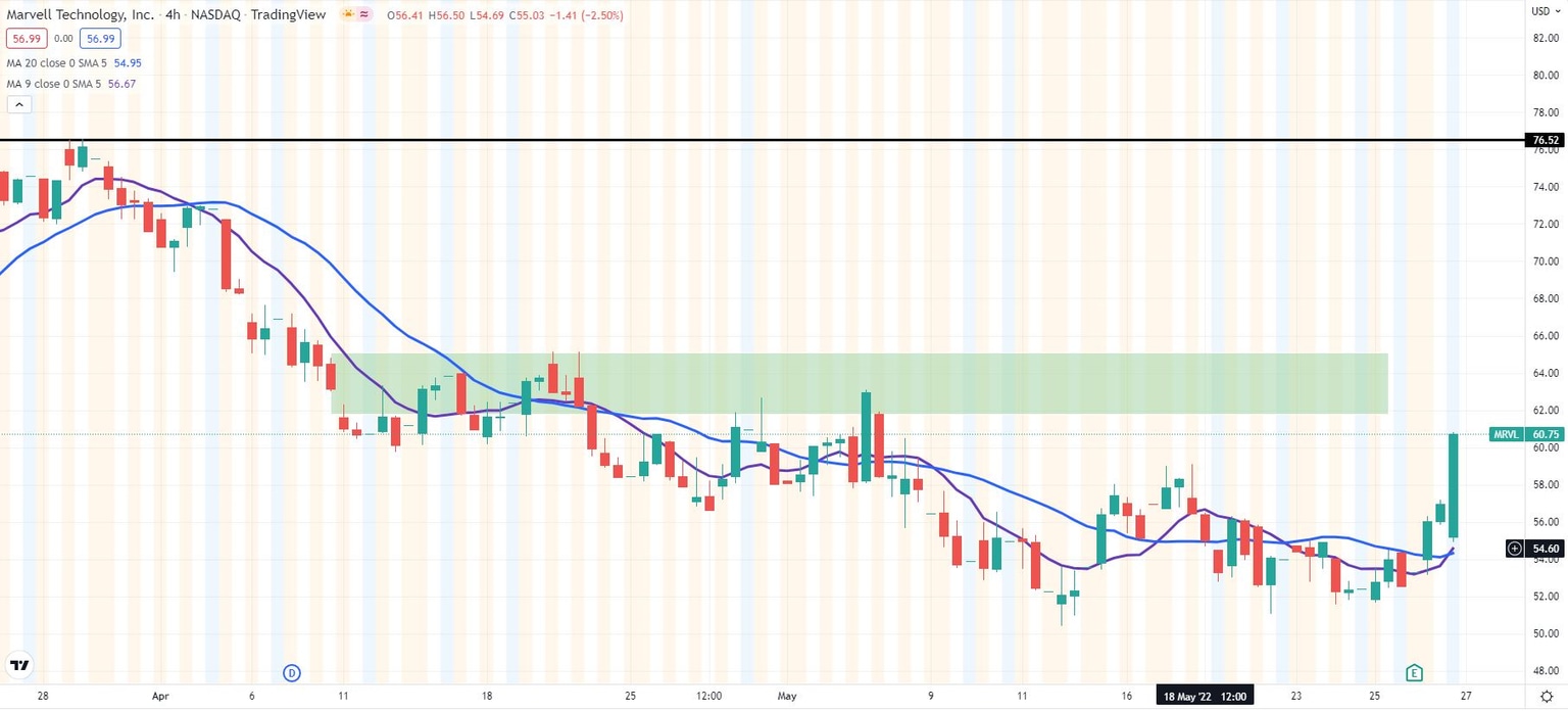 MRVL stock has already confirmed a new range high on the 4-hour chart. Below you can see it has already surpassed recent resistance at $59. Now headed for $60, the next target is $63, the recent range high.