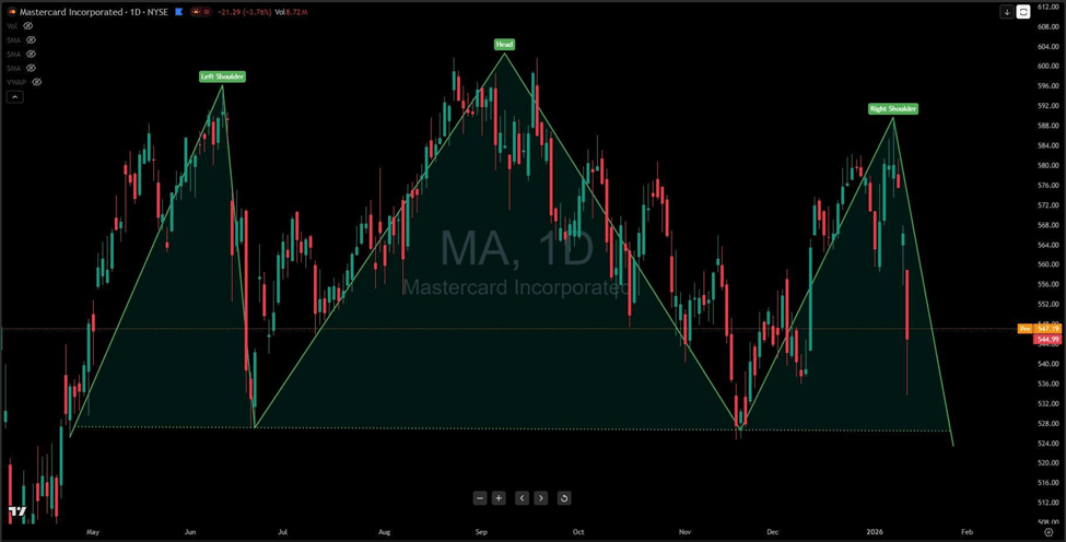 Mastercard Incorporated (MA), the global payments technology giant, has arrived at a technical inflection point on the charts after breaking down from a textbook head and shoulders topping pattern. Currently trading around $544.99, the stock has sliced through its neckline support near $525, raising questions about whether this payments leader can reclaim lost ground or if further weakness lies ahead.