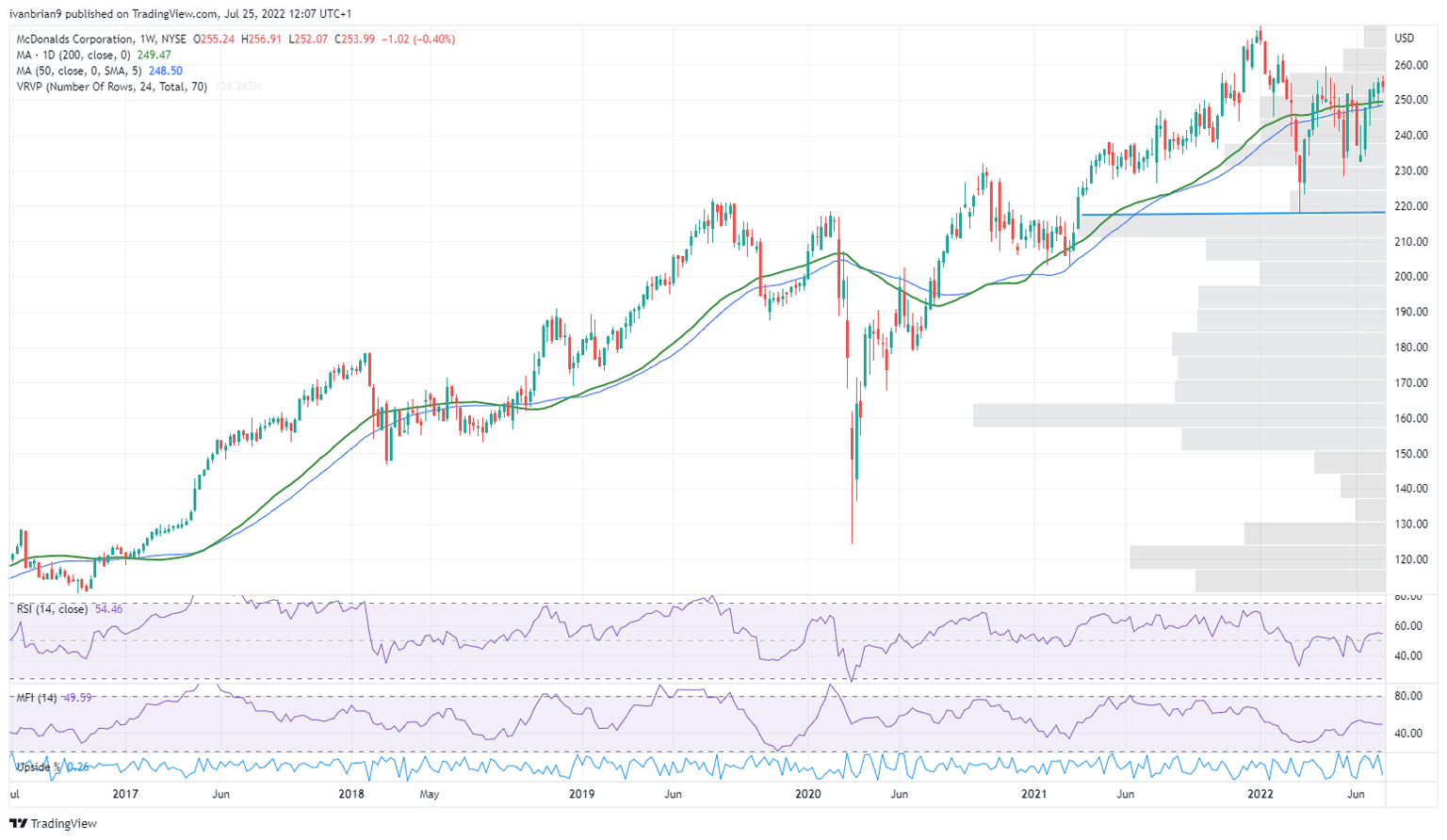 Margins are the key. How McDonald's navigates the inflationary environment with rising labor costs as well as input costs is the key to its continued high-profit levels. In terms of technicals, the stock remains in a large sideways range in 2022. There is strong support in volume terms at $218, which is also the yearly low.
