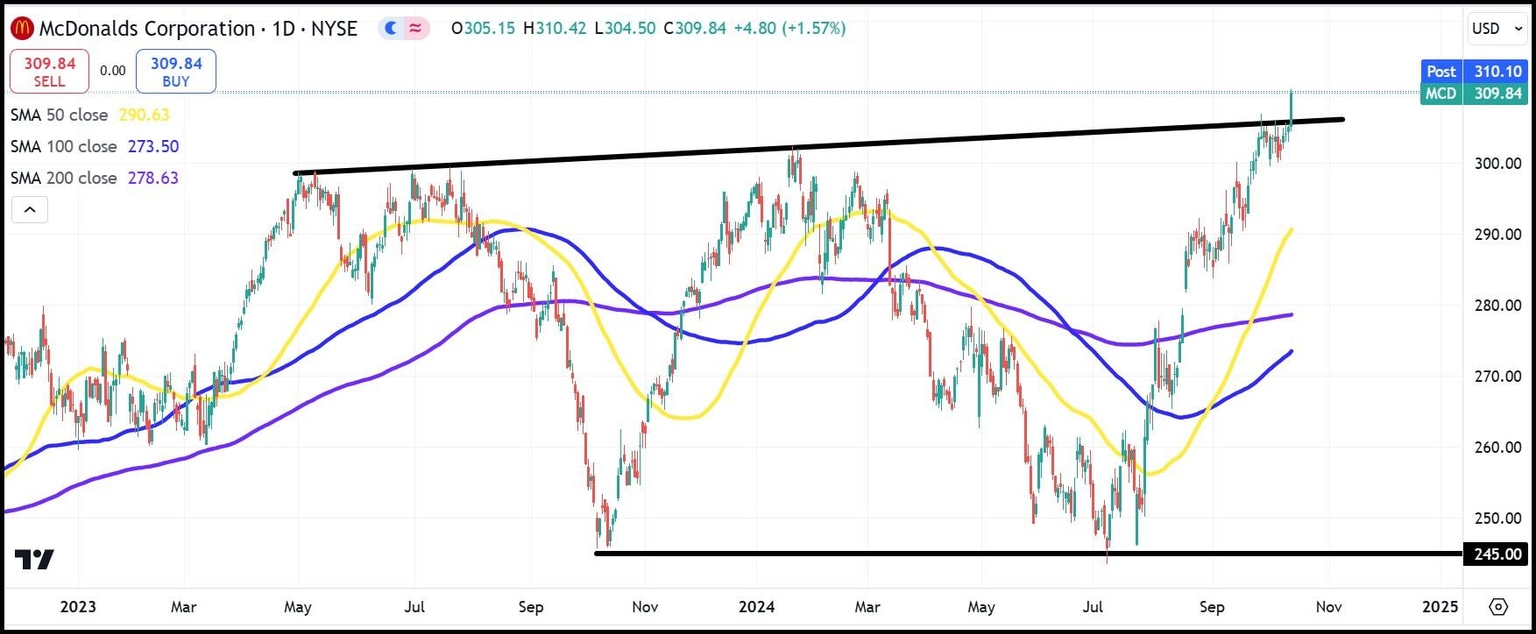 McDonald's stock reached an all-time high on Monday after breaking through long-term resistance. The stock should continued breaking higher since the resistance level that began in April 2023 has existed for about 18 months. This makes the break quite significant.