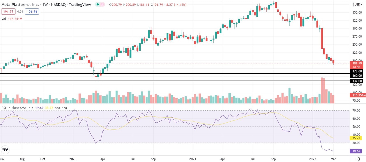 Meta Platforms (FB), the owner of Facebook, Whatsapp and Instagram, dropped 3% on Thursday to $192.60. With a reading just under 20 on the weekly chart, FB stock has reached its lowest Relative Strength Index (RSI) level ever. Shares of the forlorn social media king and future metaverse competitor are down somewhat worse than the wider market. The tech-heavy Nasdaq is down 1.7% at the same time. The market is mostly drooping due to another high inflation reading in the US and peace talks between Russian and Ukraine that failed rather quickly.