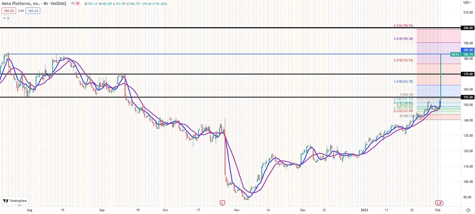 META stock exploded afterhours but interestingly stopped right at the $183/$184 highs from July and August of last year. That means Meta Platforms' share price may need to consolidate below this point before retesting it. With such a largescale jump in the share price in one session, it would not be surprising to see META stock close well below $184 on Thursday as traders understandably take profits.