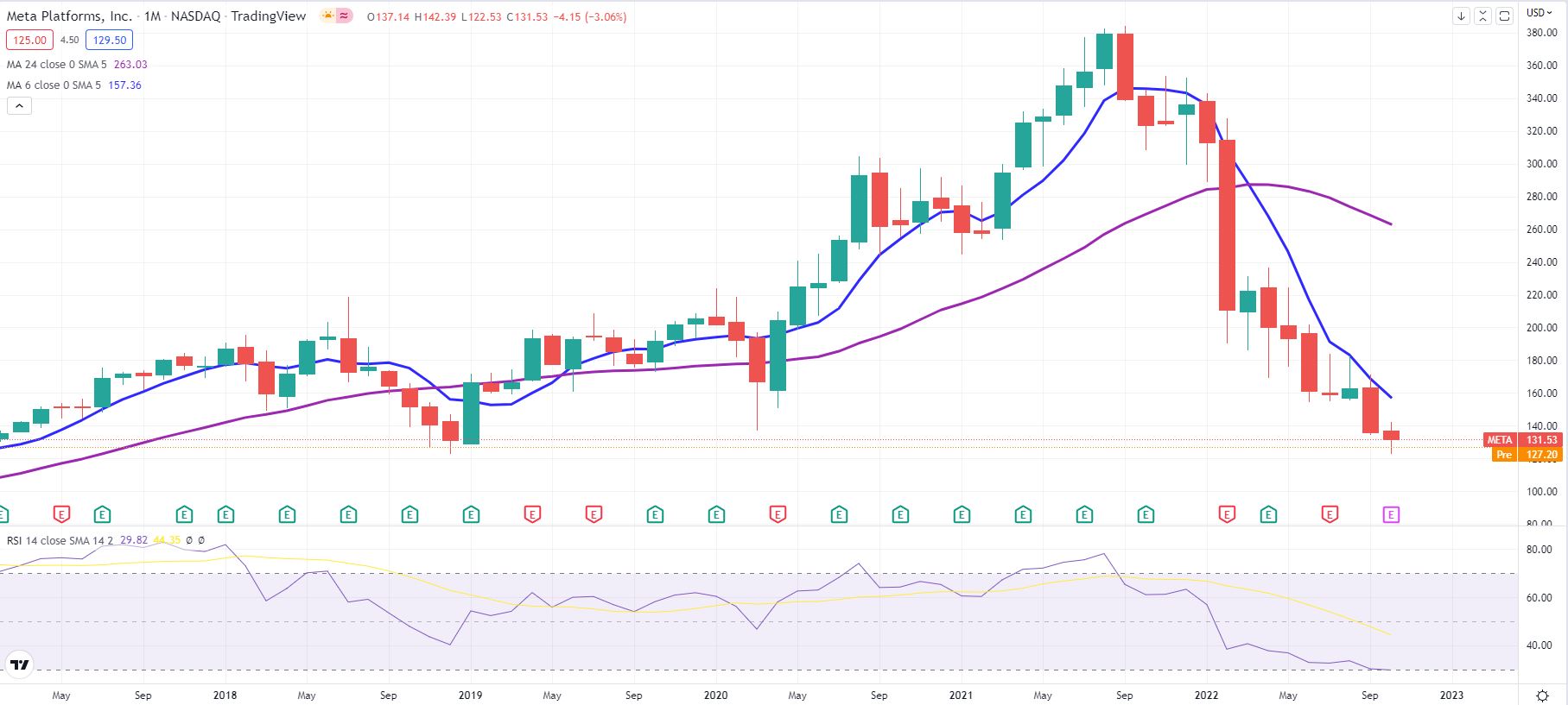 META stock has had a horrible year so far, but it is now sitting on support from November and December of 2018. Bargain basement value pickers might get interested at this level, since it holds such precedence on the monthly chart below. A break here would send shares down to support at $115 from late 2016. Isn't that something? META always seems to be finding its multi-year low at the very end of the year. It happened in 2016, 2018 and....maybe 2022. Resistance remains between $160 and $180. Lastly, it is significant that this is the first time that META stock has ever touched the oversold level on the monthly Relative Strength Index (RSI) indicator. Could this be another sign of a bottom?