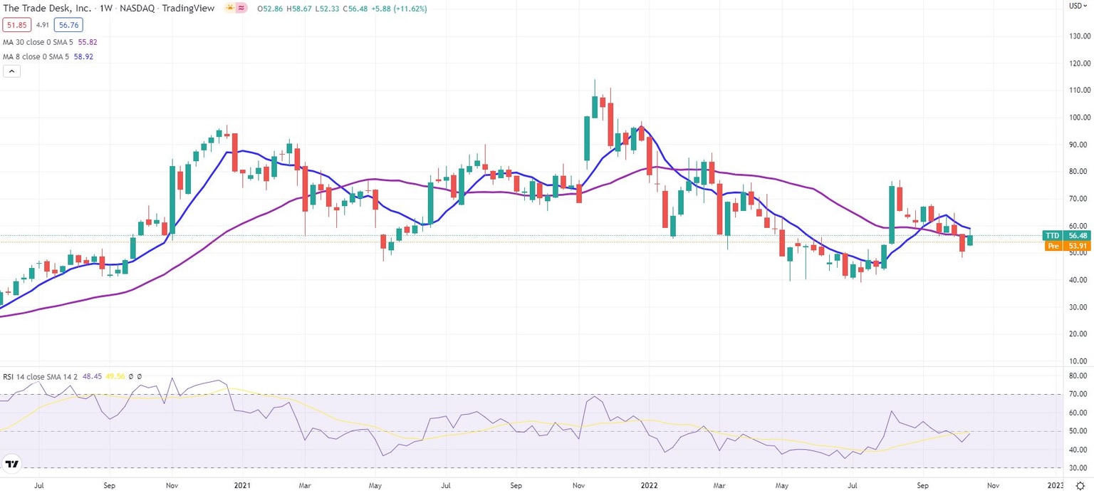 The Trade Desk stock is in a much healthier place compared with META. First, the 8-week moving average is still above the 30-week. This is a rarity among tech stocks in this down cycle. Second, TTD might have alread put in a higher low last week. At least, that is what it looks like.