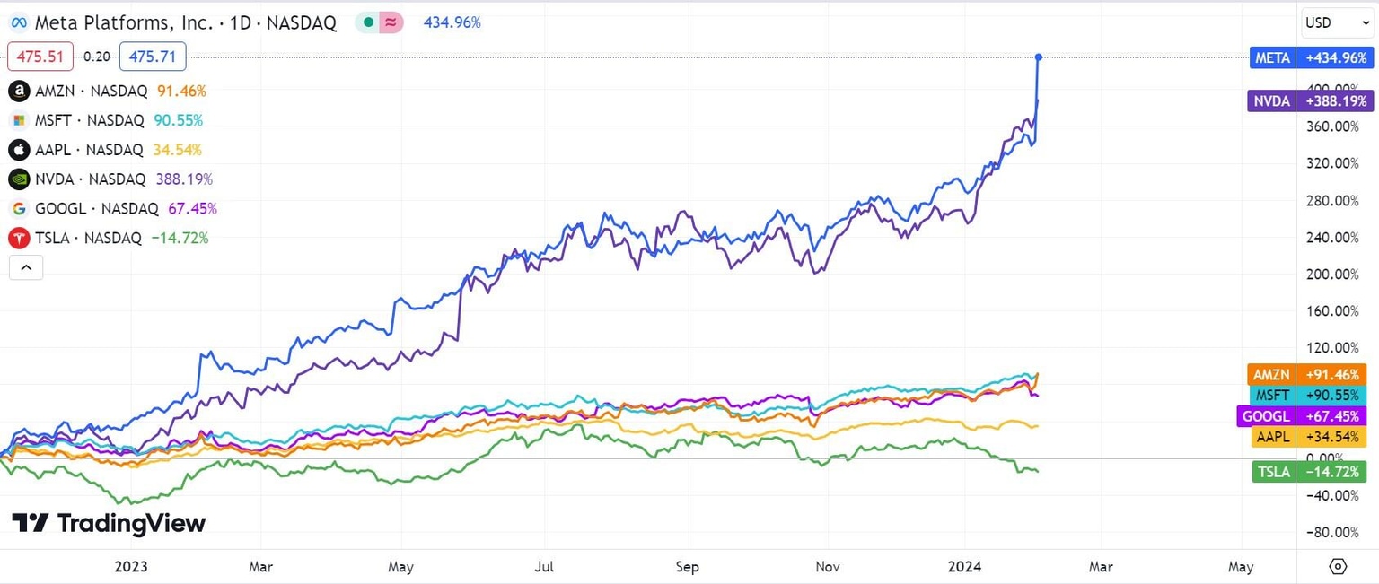 The Magnificent Seven - META, AMZN, MSFT, AAPL, NVDA, GOOGL, TSLA daily chart