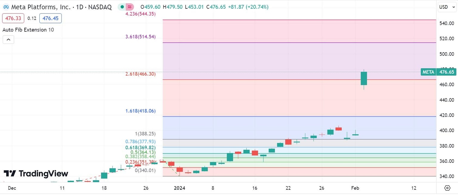 META daily chart - Fibonacci Extension