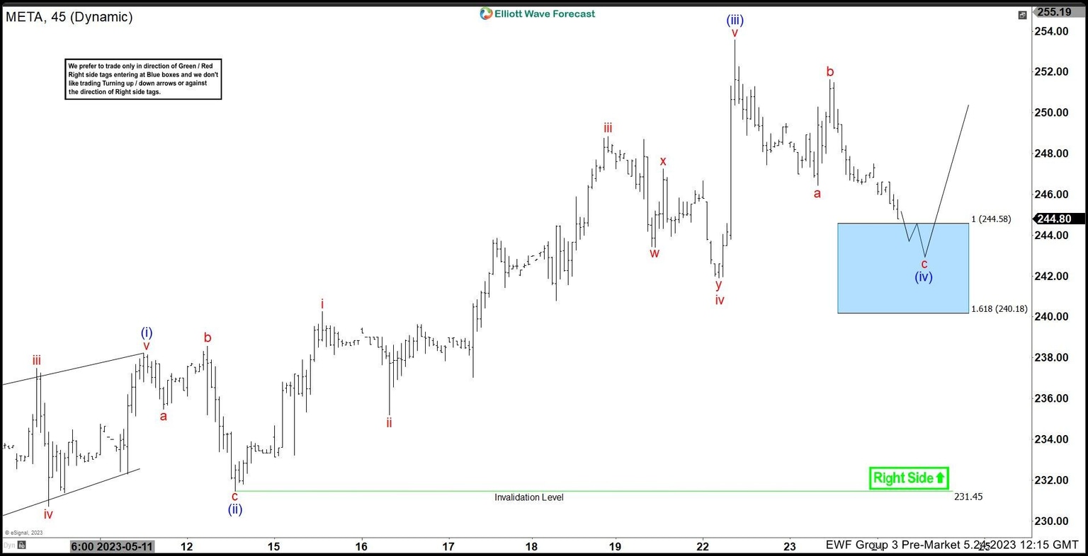 In this article we will analyze our forecast for META in the short term cycle. Since the short term peak of META from 05.22.2023 to end wave (iii) we have been expecting a pullback within wave (iv) to take place. Here at Elliott Wave Forecast we have in place a system that allows us to measure an area in which we can expect a react to take place.