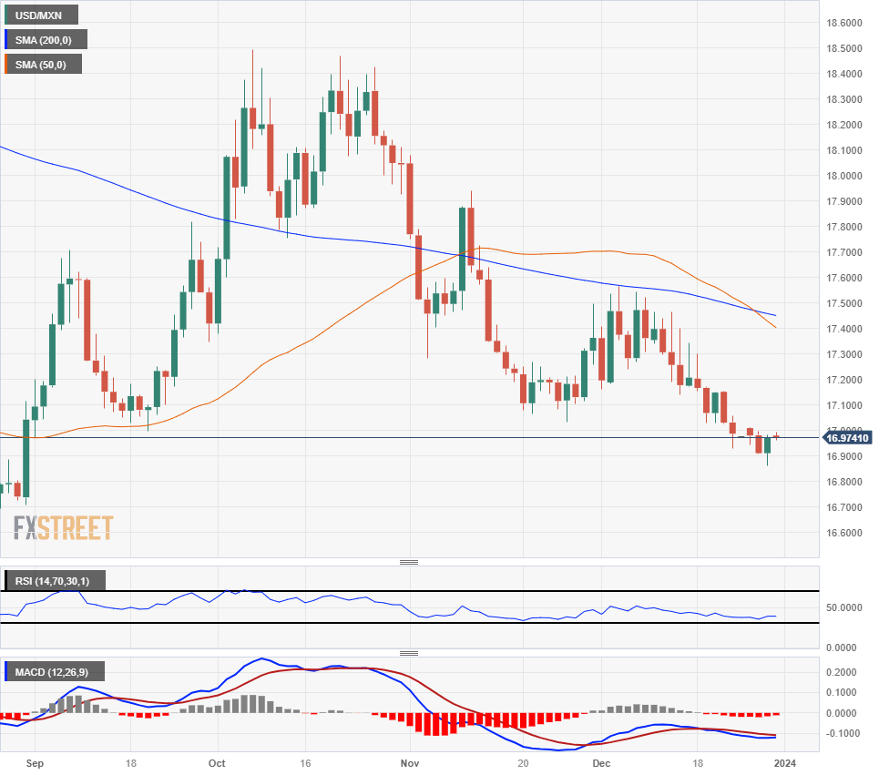 The Mexican Peso (MXN) continued to climb through the penultimate trading day of 2023 before falling once more as broad-market US Dollar flows dictate the general direction of the FX market. A thin trading week between two market holidays is seeing some rough chop as speculators churn USD flows in thin market volumes to round out the 2023 trading year.