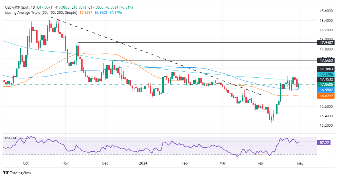 That alongside with a reacceleration of inflation, according to data revealed in the United States (US), weighed on the Mexican currency. The Greenback has recovered some ground though. At the time of writing, the USD/MXN trades at 17.08 after hitting a low of 16.95.