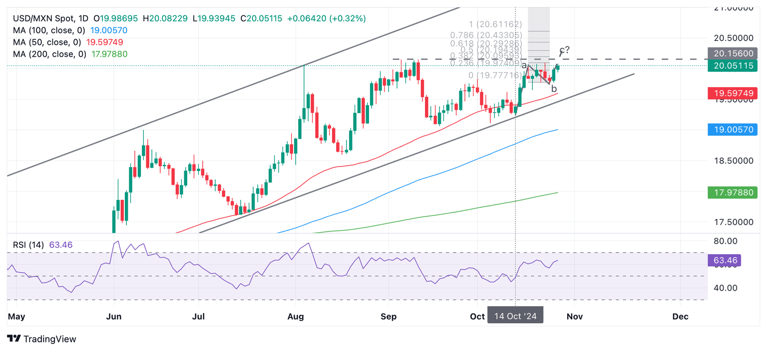 Recent below-par macroeconomic data from Mexico has not helped the MXN. Economic Activity and Retail Sales missed expectations in August, and core annualized half-month inflation showed a further decline in October. This suggests a greater chance the Bank of Mexico (Banxico) will cut interest rates by 25 basis points (bps) (0.25%) at its meeting in November.