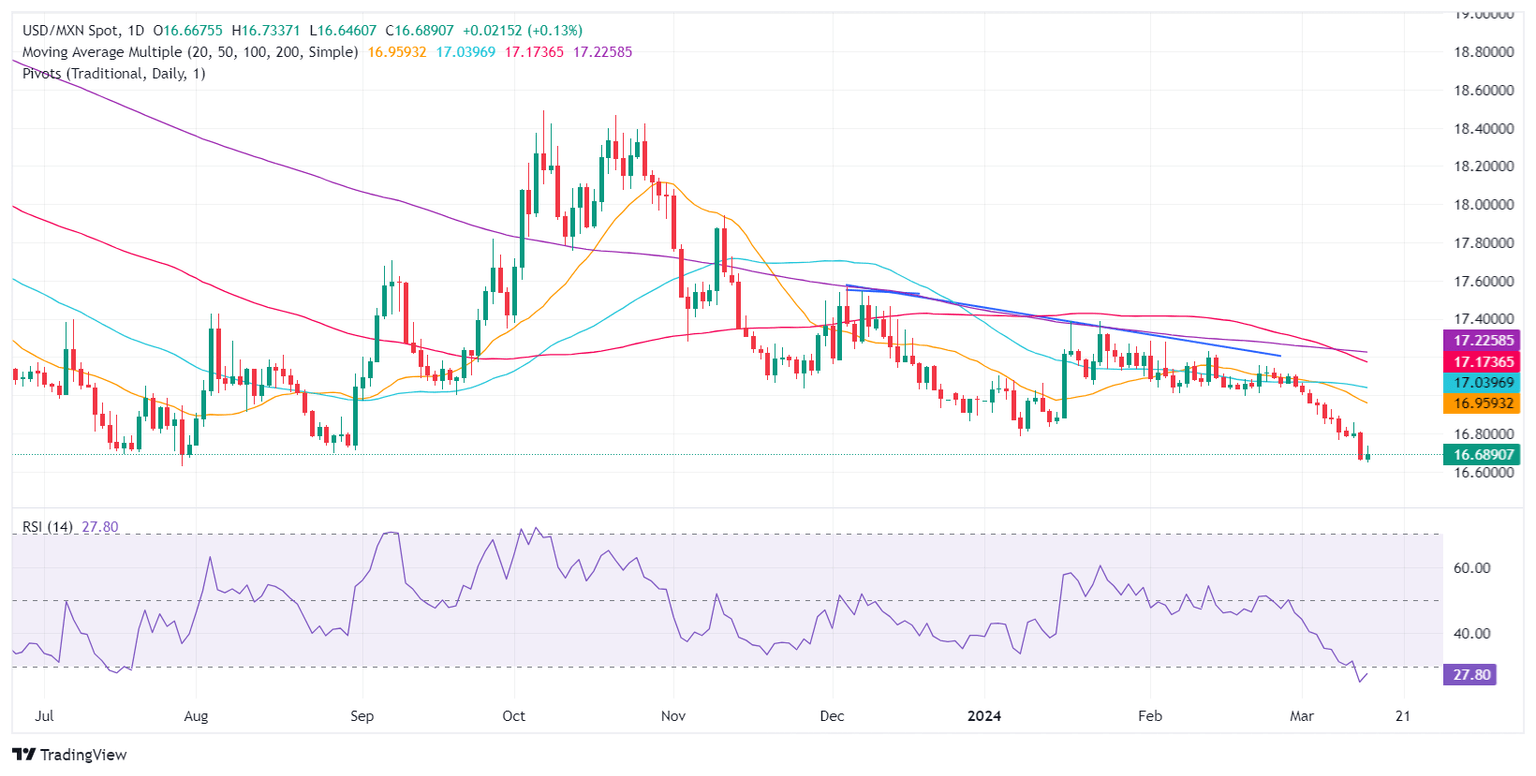 Technical analysis: Mexican Peso depreciates as USD/MXN edges toward 16.70