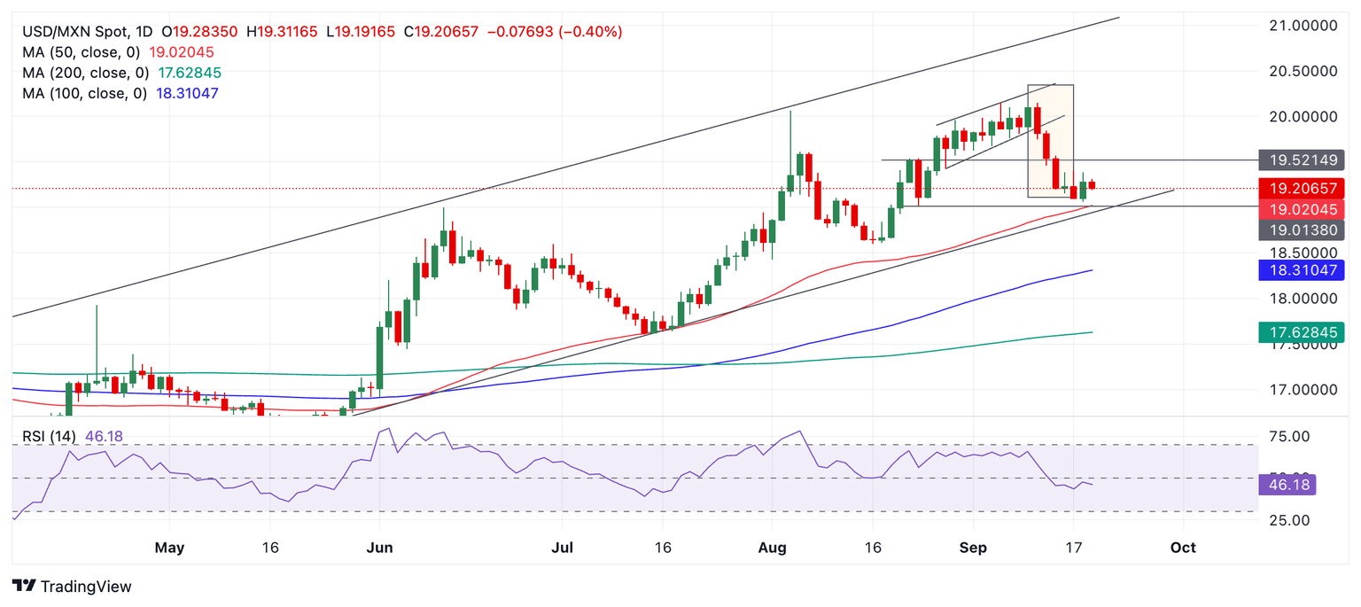 - USD/MXN is consolidating at the base of a rising channel and the 50-day SMA.