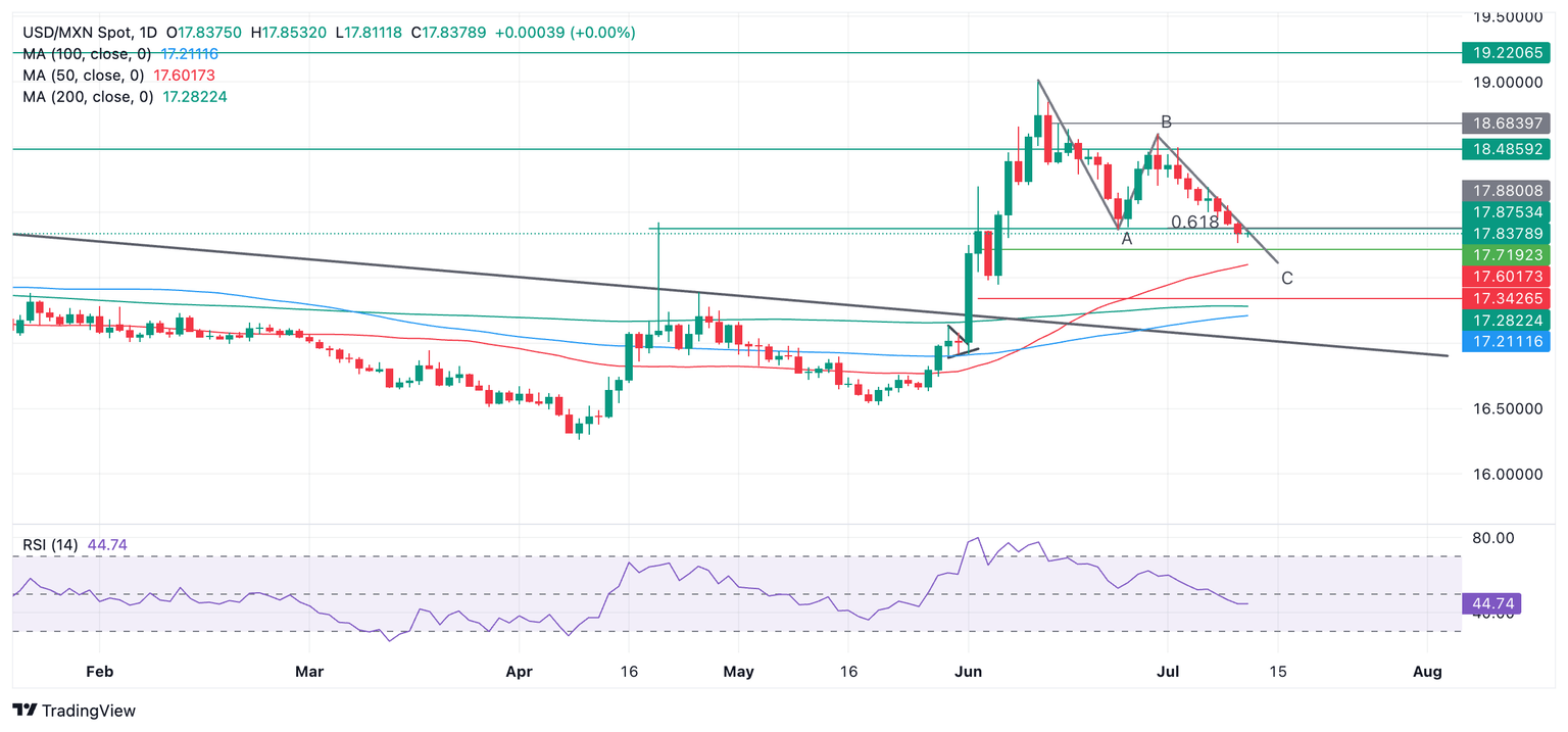 If USD/MXN breaks below Wednesday’s low at 17.76, however, it would reinvigorate bears and probably lead to a move down to the target at the end of wave C, at roughly the level of the 50-day Simple Moving Average (SMA) situated at 17.60.