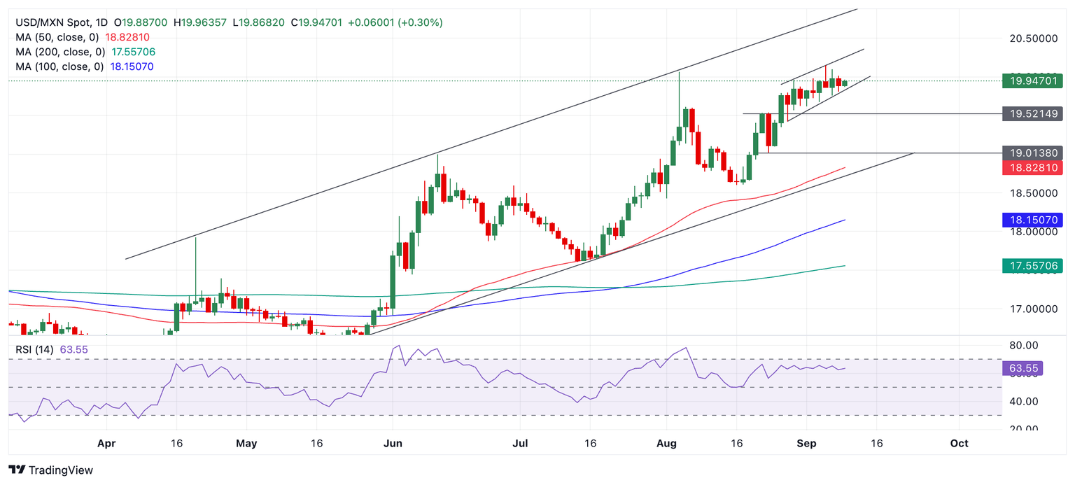 USD/MXN is trading within the bounds of a gently ascending mini-channel, which itself lies within a broader rising channel that began in April.