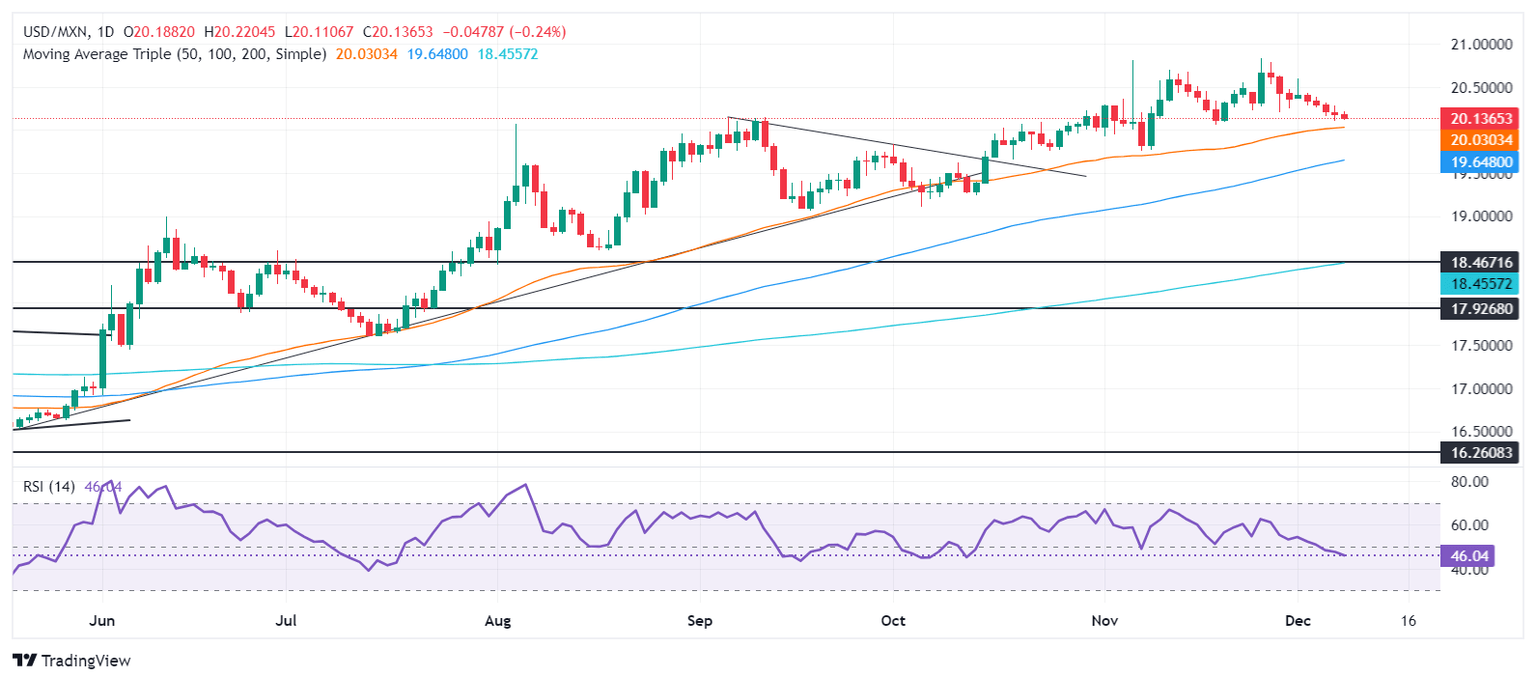 The USD/MXN dipped as low as 20.09 last Friday, near the 50-day Simple Moving Average (SMA) at 20.00. Momentum shifted to the downside as the Relative Strength Index (RSI) turned bearish, indicating that the exotic pair could test the 20.00 mark.
