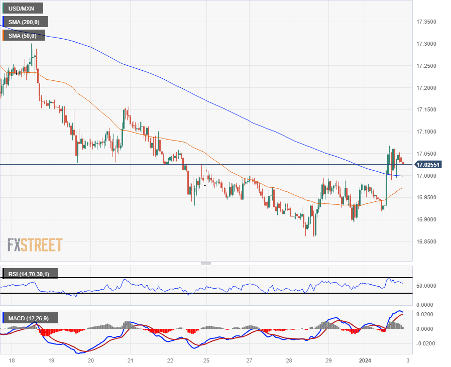 The Mexican Peso (MXN) is slipping back from near-term highs, getting pushed back down as market pivot into Greenback bets. The USD/MXN has rebounded above the 200-hour Simple Moving Average (SMA), climbing back over the 17.00 level following last week’s decline to a multi-month low of 16.86.