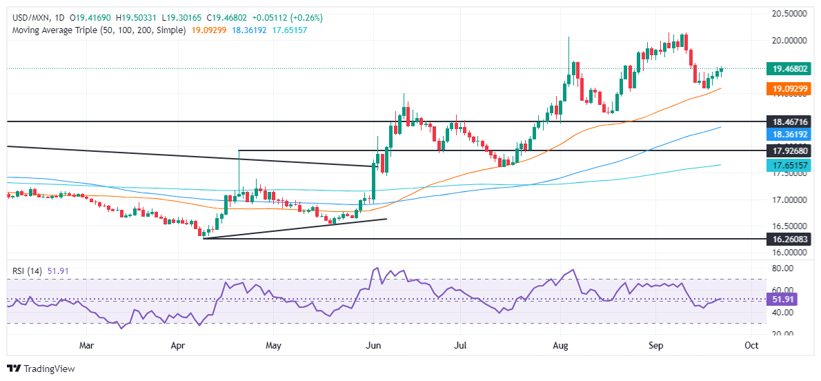 The USD/MXN's next resistance will be 19.50, followed by the August 6 high at 19.61. Once cleared, the 20.00 will follow, followed by the year-to-date (YTD) peak at 20.22. Conversely, if USD/MXN extends its losses below the September 23 low of 19.29, it will expose the confluence of the 50-day Simple Moving Average (SMA) and the September 18 low near 19.08 to 19.06.