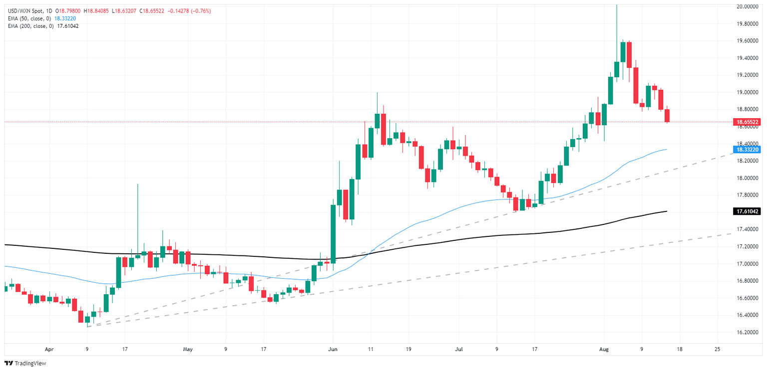 The Mexican Peso chalked in a third straight gain on Thursday as the US Dollar moved out of the way to allow a Peso recovery. USD/MXN has eased below 18.80 for the first time since the beginning of August and is headed toward the 50-day Exponential Moving Average (EMA) near 18.33 as long as current trends hold.