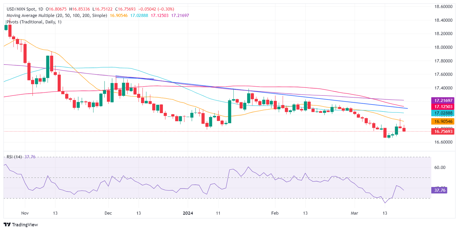 The Mexican Peso (MXN) recovers territory on Wednesday against the US Dollar (USD) after the US Federal Reserve’s (Fed) decided to keep rates unchanged as expected, while maintaining three ratce cuts projected for 2024. During the first half of the week, the Mexican currency has been on the defensive amid speculation that on Thursday, the Bank of Mexico – also known as Banxico – might begin its easing cycle. At the time of writing, the USD/MXN trades at 16.67, down 0.76%.