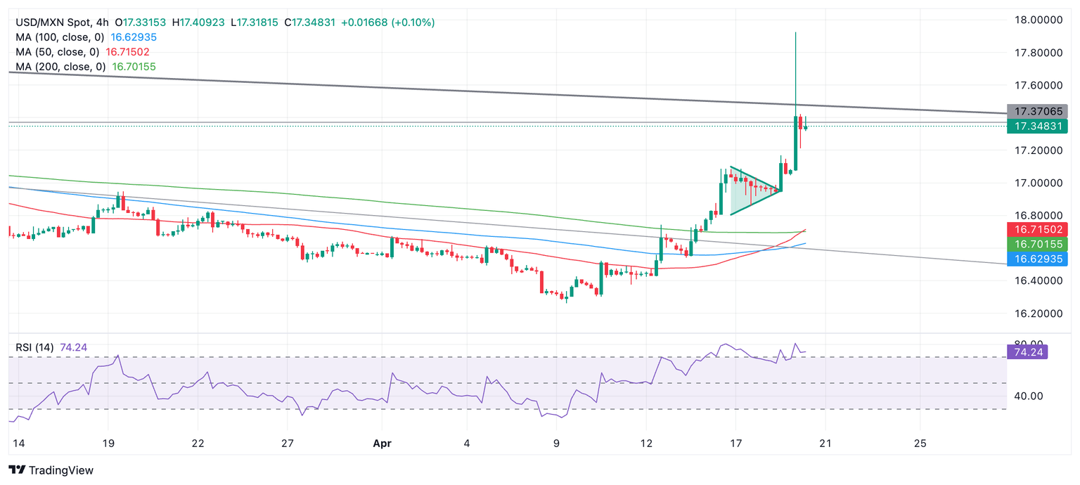 USD/MXN – the value of one US Dollar in Mexican Pesos – broke out of the bullish Pennant price pattern it had formed on the 4-hour chart, surged up to the target for the pattern at roughly 17.43, and then surpassed it.