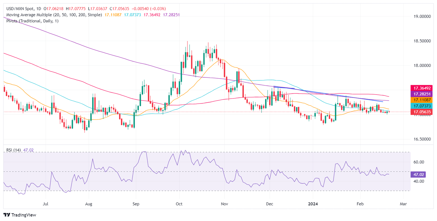 The USD/MXN remains in consolidation, at around 17.05, awaiting a fresh catalyst. If buyers regain the 50-day Simple Moving Average (SMA) at 17.07, the pair could rally toward the 200-day SMA at 17.28. A breach of the latter will expose the 100-day SMA at 17.38, ahead of the 17.50 mark.