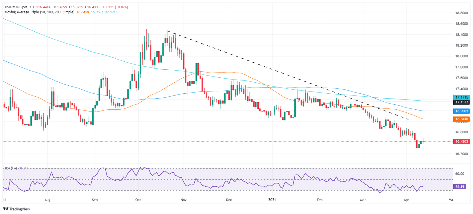 The Mexican Peso depreciated modestly against the US Dollar for the third straight trading session on Thursday, following a red-hot consumer inflation report on Wednesday. Further economic data from Mexico and the United States (US) keeps the exotic pair within familiar levels, though the downtrend remains intact. The USD/MXN trades at 16.43, virtually unchanged.