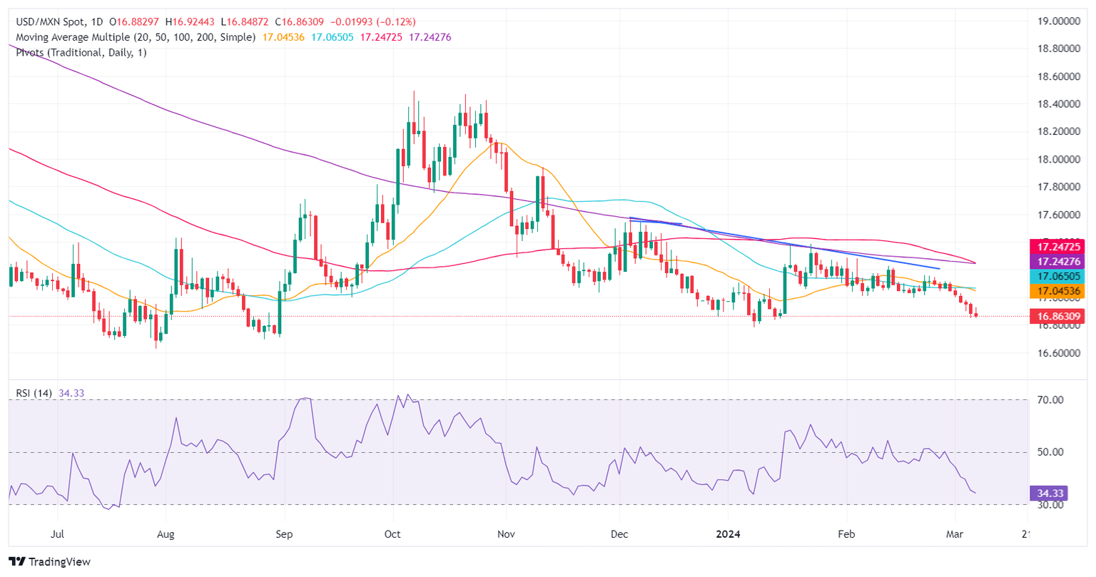 Technical analysis: Mexican Peso advance continues as USD/MXN holds firm below 16.90