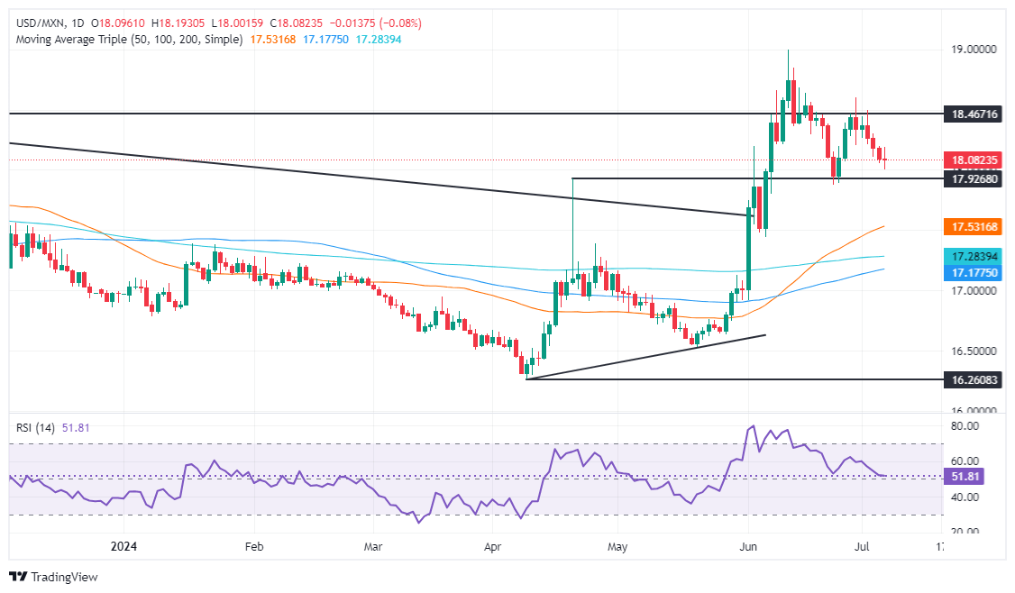 For a bullish resumption, the USD/MXN must surpass 18.10, followed by a rally above the June 28 high of 18.59, so buyers can challenge the YTD high at 18.99. Conversely, sellers will need a drop below 18.00, which could extend the pair’s decline toward the December 5 high, which turned support at 17.56, followed by the 50-day Simple Moving Average (SMA) at 17.37.