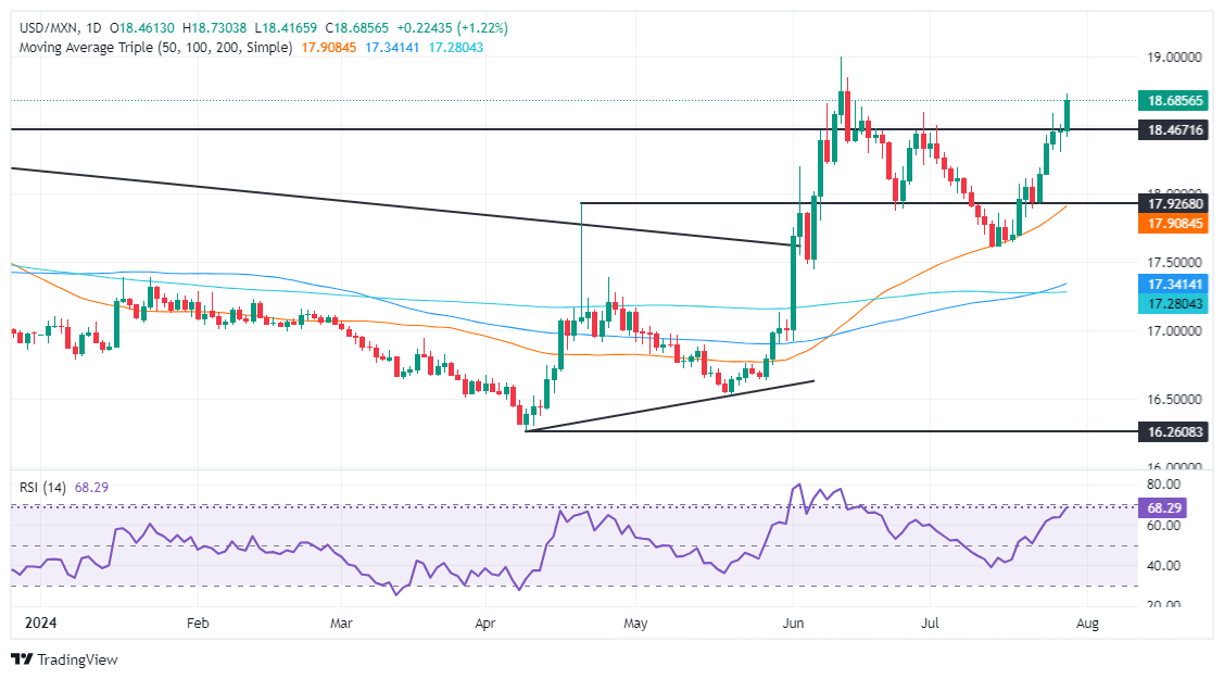 The uptrend continues, as shown by the USD/MXN hitting the 18.70 mark due to month-end flows and risk-aversion, which has undermined high-yielding currencies like the Peso. Momentum is bullish, confirmed by the Relative Strength Index (RSI) reading above the 50-neutral line.