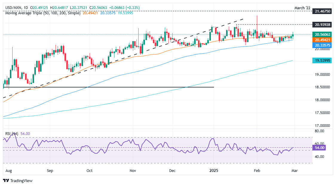 USD/MXN maintains a bullish bias and a break above the 50-day Simple Moving Average (SMA) at 20.45 would pave the way for a push toward 20.50. The Relative Strength Index (RSI), now above 50, reached its highest level in February, signaling strong bullish momentum. Buyers will aim to clear the January 17 high of 20.93, followed by 21.00, and the year-to-date (YTD) high of 21.28.