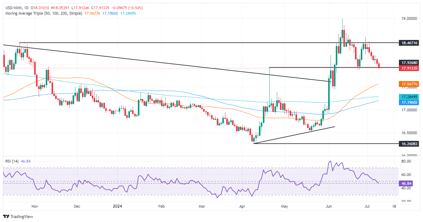 The Mexican Peso surged during Tuesday’s North American session as June headline inflation exceeded consensus. This might prevent the Bank of Mexico (Banxico) from slashing interest rates amid a domestic economic slowdown. At the time of writing, the USD/MXN trades at 17.90, down 0.56%.