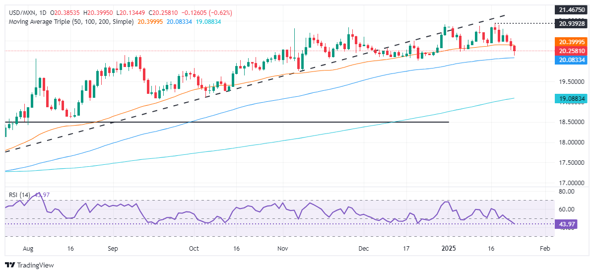 The USD/MXN falls below the 50-day Simple Moving Average (SMA) of 20.37 and extended its losses toward the 100-day SMA at 20.22, but bears failed to push prices below the latter, as it consolidates near the mid-point of the 20.20 – 20,30 range.