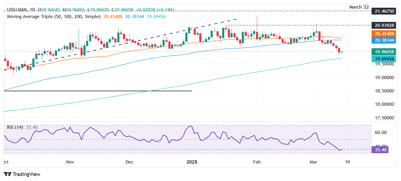 USD/MXN technical outlook: Mexican Peso climbs as USD/MXN drops below 20.00