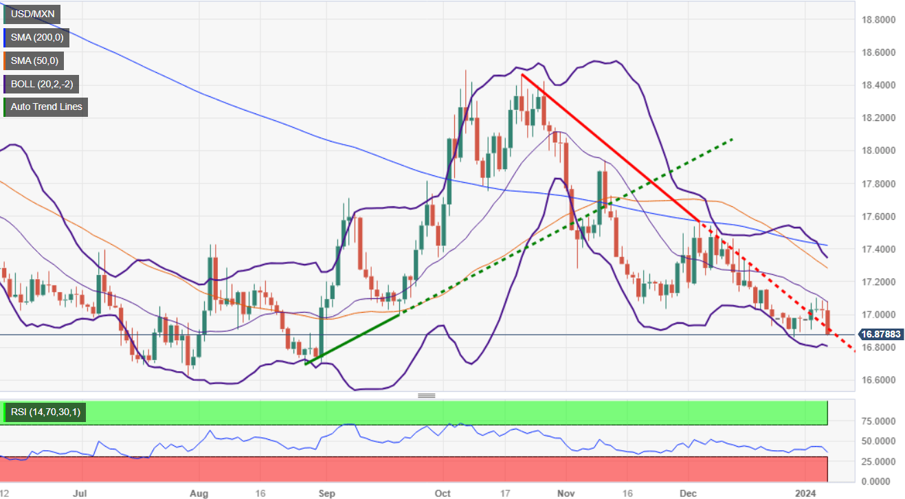 The Mexican Peso (MXN) stages a comeback and registers a new three-day high against the US Dollar (USD) after the US Bureau of Labor Statistics (BLS) revealed the economy in the United States (US) added more jobs than expected in December. Recently, additional data from the Institute for Supply Management (ISM) suggests that business activity in the services sector is at recessionary levels, weighing on the Greenback. At the time of writing, the USD/MXN is trading at 16.87, down 0.83%.