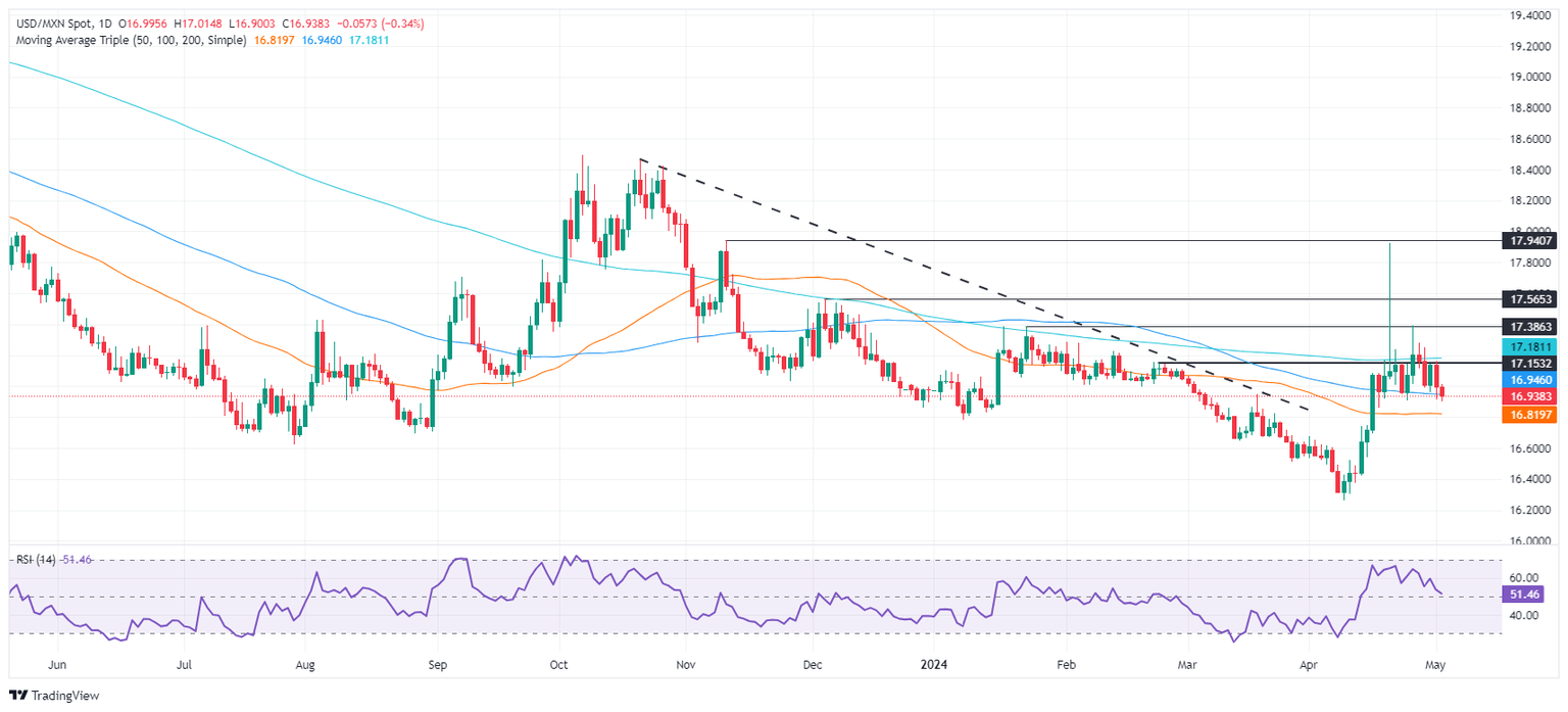 The Mexican Peso rose for the second straight day on Thursday against the US Dollar, yet despite hitting a new weekly high of 16.90, lost some ground towards the end of the trading session. Market participants had begun to price in a rate cut by the US Federal Reserve following its decision to keep rates unchanged. The USD/MXN trades at 16.97, down by 0.07%.