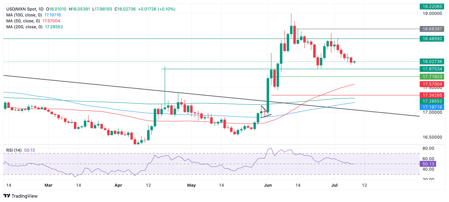 USD/MXN continues steadily declining as a short-term downtrend unfolds towards the key June 24 line-in-the-sand low at 17.87.